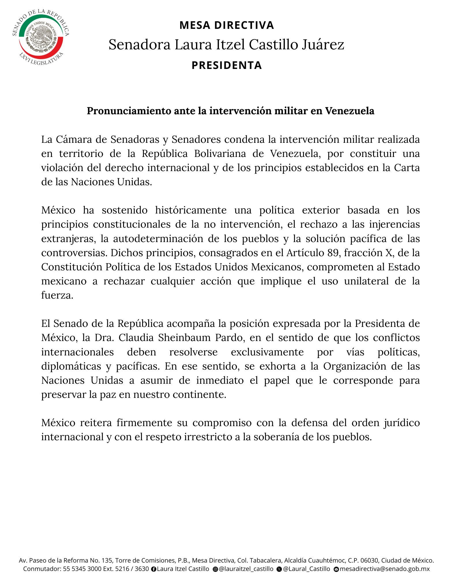 La Mesa Directiva del Senado de la República, presidida por la senadora Laura Itzel Castillo Juárez, emitió un pronunciamiento oficial en el que condena de manera categórica la reciente intervención militar en territorio de la República Bolivariana de Venezuela. El órgano legislativo calificó estas acciones como una violación flagrante del derecho internacional y de los principios fundamentales establecidos en la Carta de las Naciones Unidas.