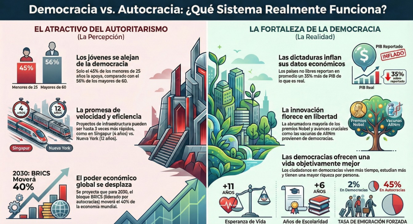 Luego está la trampa más seductora de todas: la del “miren qué rápido construyen”. A la Gen Z —y a cualquiera con la paciencia raspada— la democracia le puede parecer lenta, torpe, desesperante. Hay un dato que hiela: un buen porcentaje de jóvenes aceptaría un líder fuerte que gobierne sin elecciones, con tal de que “resuelva”. Y claro, cuando comparas obras: Nueva York tarda más de una década en sacar una línea de metro, y Singapur en unos años ya la tiene brillando… pues la tentación se entiende. El problema es que nadie te cuenta el costo escondido: en los sistemas donde todo se hace rápido, también se calla rápido.